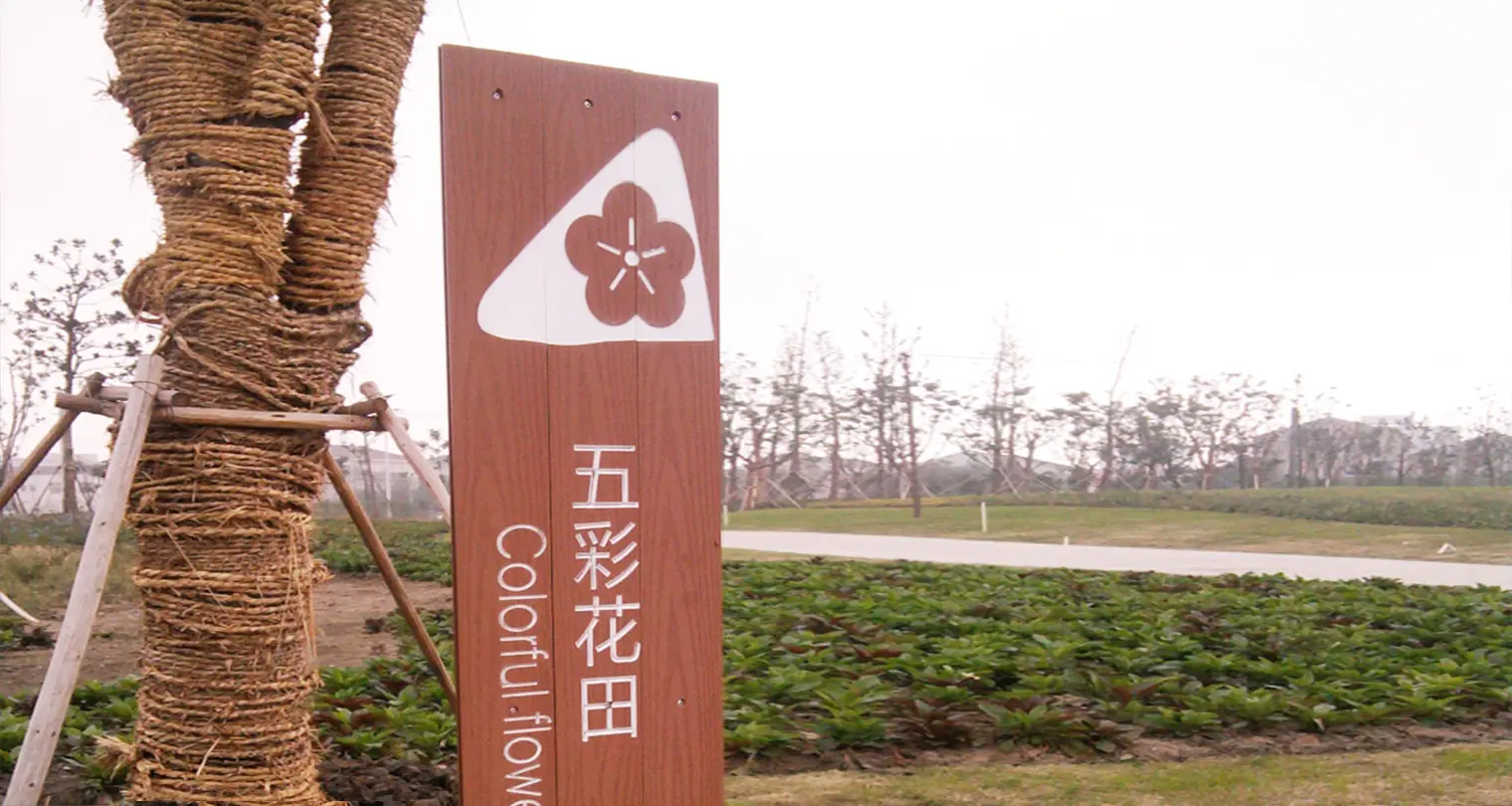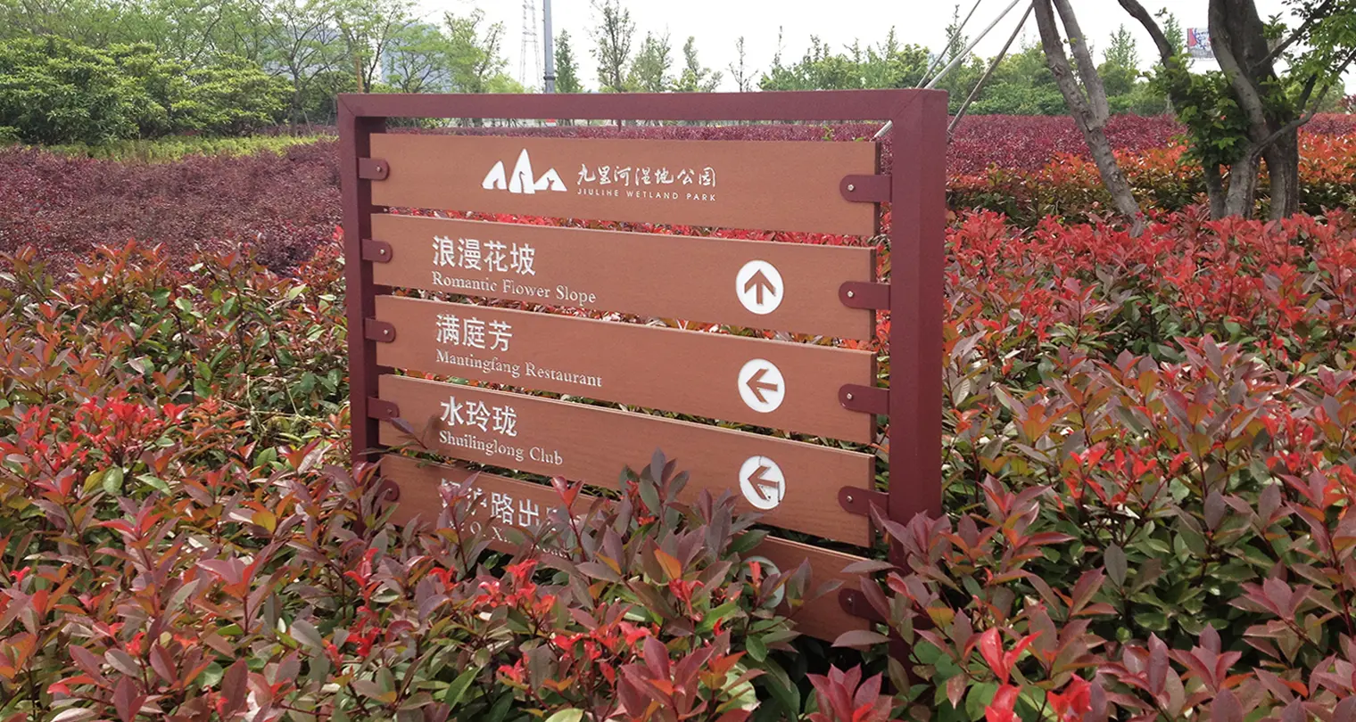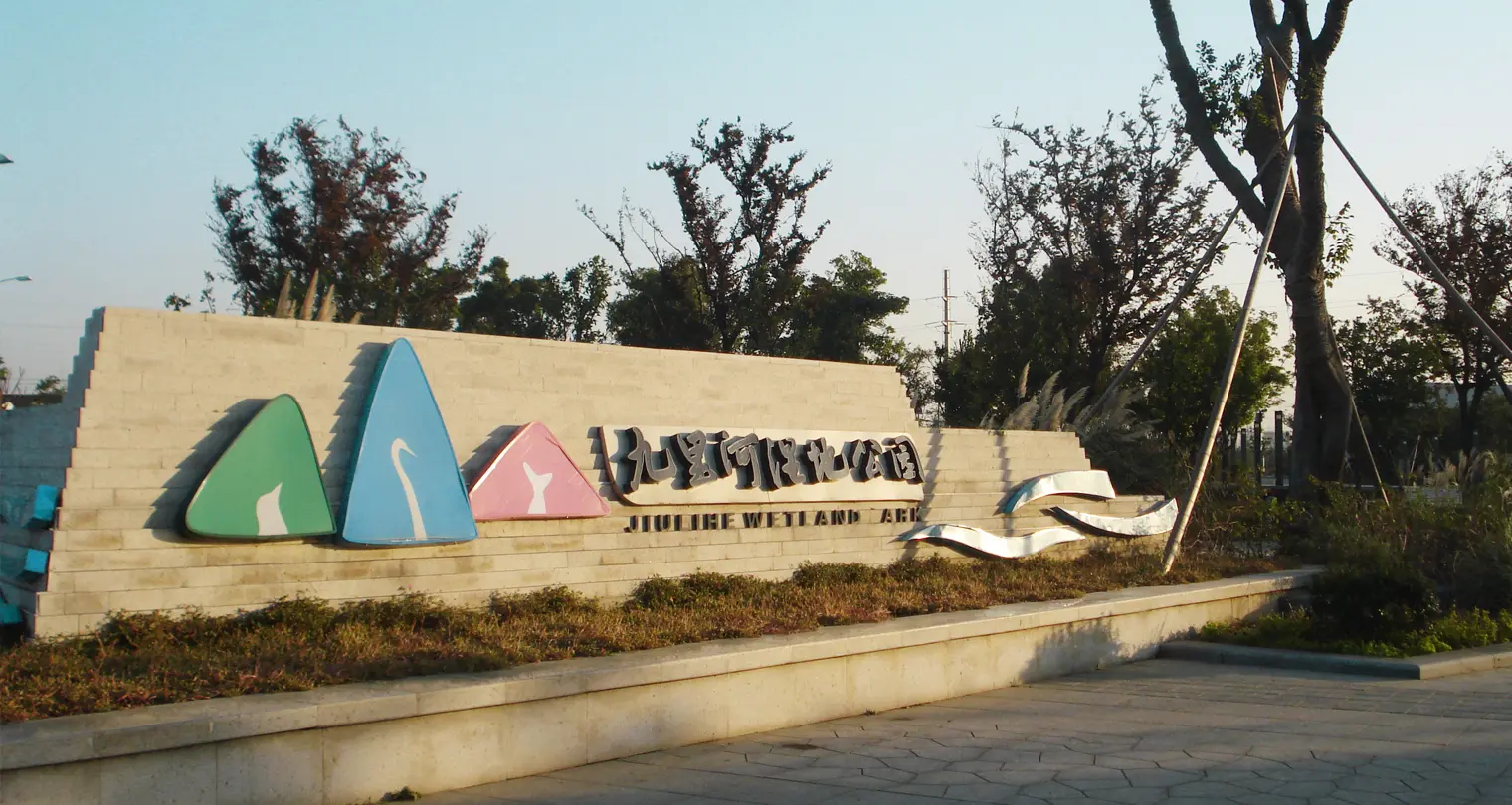 2011年,江大设计传播机构受邀为九里河湿地公园进行环境系统视觉设计。江大通过对项目地的勘察及文化背景的研究,提出“山水互生”的概念,山有水影,水借山形。同时根据项目设置,将生态公园划分为五大特色区,形成多层次的自然景观体验。