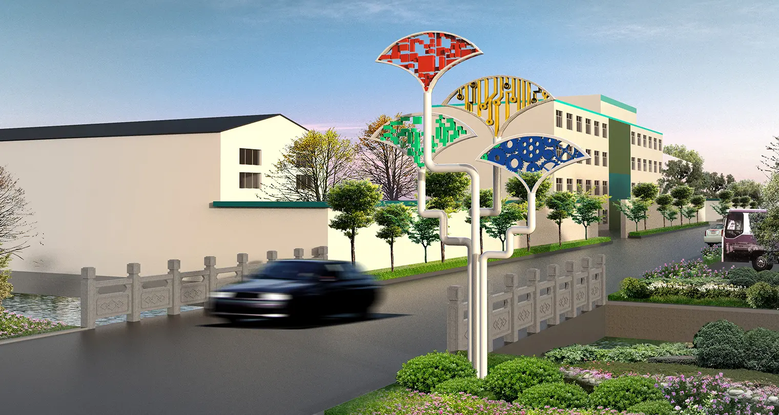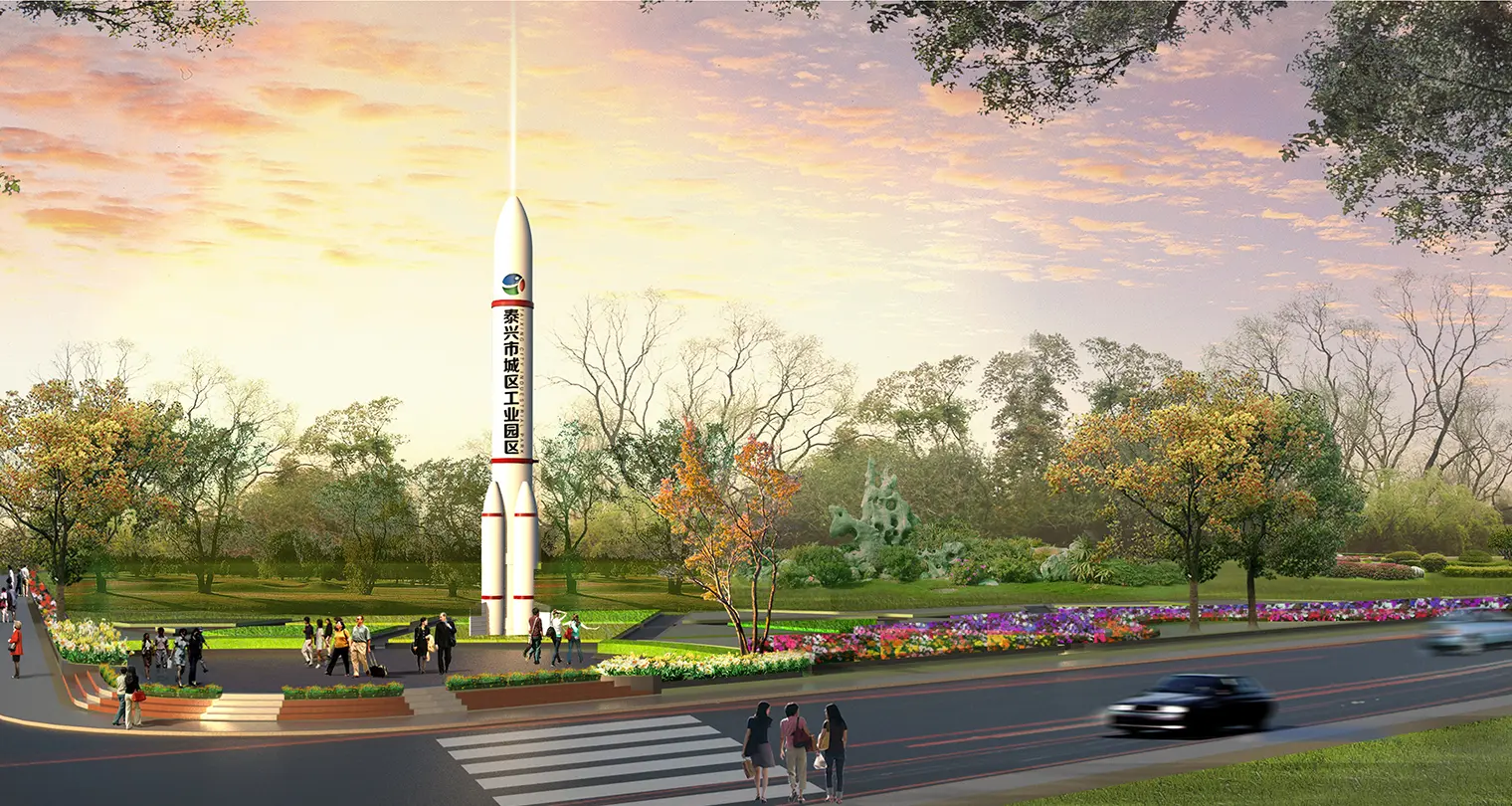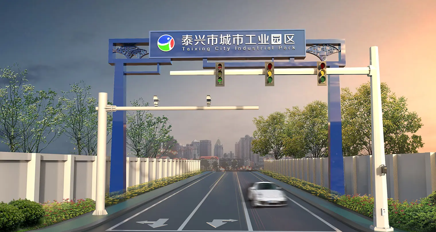 2015年,江大设计传播机构受邀为泰兴城市工业园区进行环境视觉设计。江大强调工业园区中地缘性文化与产业化要素的同构,将银杏叶为主要元素,采用工业1.0、2.0、3.0、4.0的代表符号与其融合创新,凸显科技感与空间感,突出泰兴元素,以塑造独特的工业园区氛围。